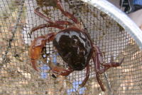 ひととおり遊んで、やっと生き物探しの開始。まずは水辺から。上から見ても何にもいないのに台所用の金かごで探ってみると・・。サワガニ、イモリ、ヘビトンボの幼虫・・・、いろんな生き物がいました。 雪の残った田圃の上には、ノウサギの足跡、近くにはフンもありました。足跡、変な形だね。どうやったらこんな形になるんだろう?前足がトントン、後ろ足でパタッ。みんなで練習してみました。 エノキの落ち葉の下にはオオムラサキの幼虫。「ぜんぜん動かないね」。ちょっと暖めてあげたら少し動きだしました。「せっかく寝てるのに起こしたらかわいそう!」。そうだね、そっとしとこうね。 |